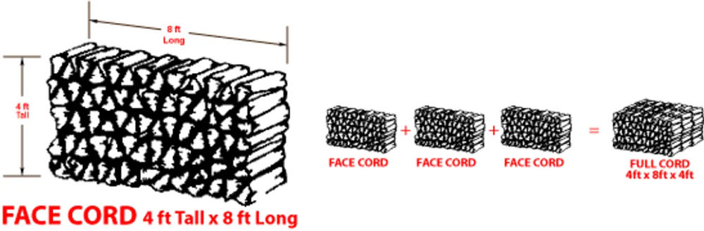 This is the standard method of measurement we use for a cord. A "Face Cord" differs from a full, standard cord in measurements. A "Face Cord" is measured 4 ft tall by 8 ft wide by 16 inches in depth. It takes 3 of these "Face Cords" to complete a full, standard cord. This is measured as 4 ft tall by 8 ft wide by 4 ft in depth. You can refer to the image below for a visual representation.